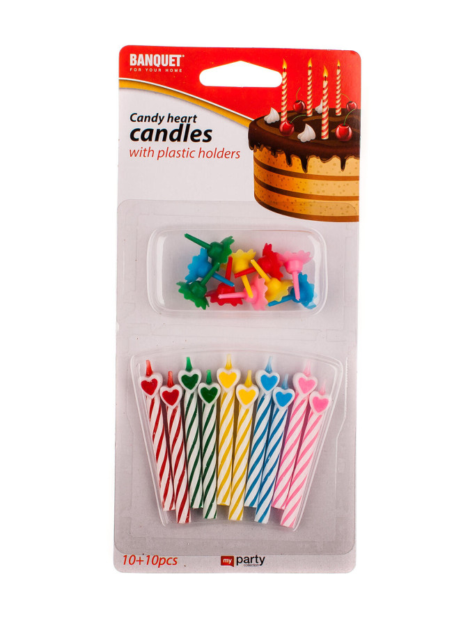 Svíčka narozeninová SRDCE (10 ks) mix barev, MY PARTY. balení: 10 ks mix barev Sada narozeninových svíček se srdíčkem, mix různých barev. Sada obsahuje: 10 ks svíček a 10 ks plastových bodců. Výrobek využijete na zahradní párty, pikniku apod. Výška přepravní: 1 cm Šířka přepravní: 10 cm Hloubka přepravní: 21 cm Objem přepravní: 0,21 dm3 Hmotnost přepravní: kg Pozor křehké:
