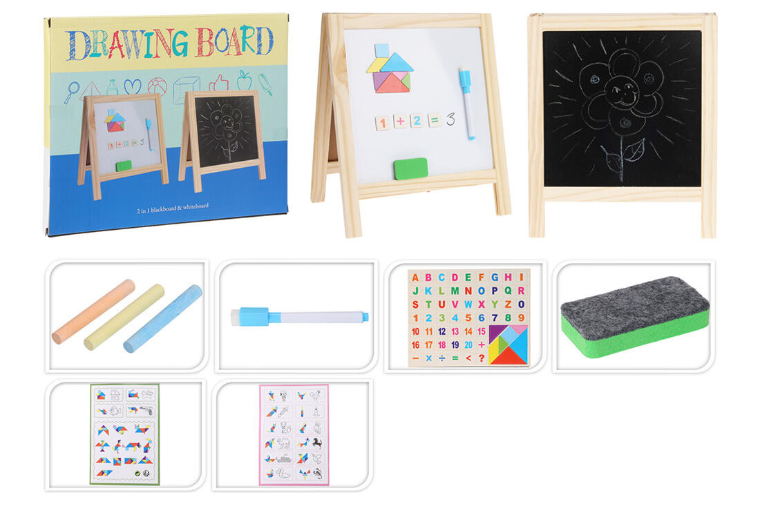 Tabule na kreslení 2 v 1, 32 x 27 cm, BÍ / ČER + příslušenství. sada obsahuje: - oboustrannou tabuli - magnety - magnetická písmenka - popisovač - houbu - křídy rozměry tabule: 32 x 27 cm Oboustranná tabule - bílá a černá strana, s dřevěným stojánkem. Bílá strana je magnetická, černá strana je určená pro kreslení křídami. Výška přepravní: 3,5 cm Šířka přepravní: 28 cm Hloubka přepravní: 32,5 cm Barva: Objem přepravní: 3,185 dm3 Hmotnost přepravní: 0,576 kg Výška: 0 cm Materiál: Šířka: 0 cm Licence: Průměr: cm Elektroodpad: Zobrazení času: Určení nábytku: Listingový popis: Výbava: Typ: Typ strojku: Pozor křehké: