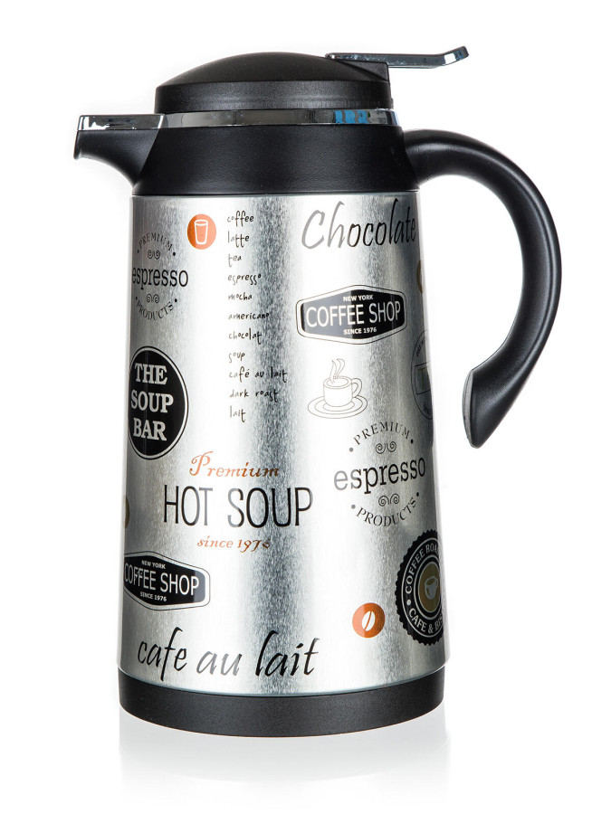 Termokonev CONTE 1 l, nerez + PH, s potiskem. objem: 1 l průměr: 13 cm výška: 26 cm materiál: kov s potiskem, plast PP (víčko a držadlo), pochromovaný ABS plast, silikonové těsnění, skleněná vložka (bezazbestová) Termokonvice CONTE s potiskem má skleněnou termoizolační vložku a vnější část je vyrobena z kovu a plastu. Termokonvice je vhodná pro teplé i studené nápoje. Výška přepravní: 26,5 cm Šířka přepravní: 14 cm Hloubka přepravní: 21 cm Objem přepravní: 7,791 dm3 Hmotnost přepravní: 0,68 kg Pozor křehké: