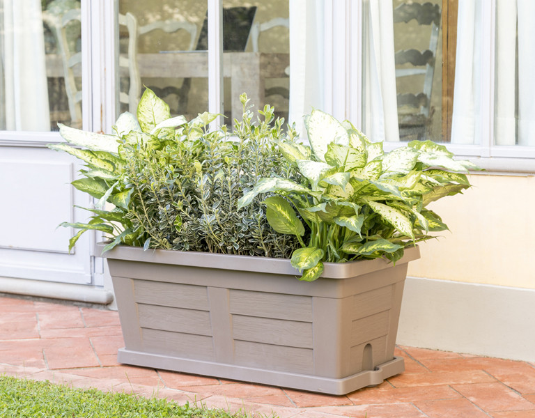 Zahradní velkoobjemový truhlík s texturou dřeva a s profilovanou spodní miskou. Dno truhlíku je profilované a precizně zapadá do misky, která je prostorná a dostatečně velká pro zálivku.