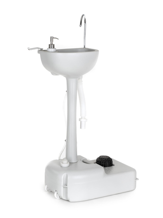 Umyvadlo přenosné. Přenosné stojanové umyvadlo lze využít na chatě, v kempu, v karavanu či na farmářských trzích, stáncích s občerstvením, všude tam, kde jsou kladeny požadavky na hygienu a potřebu zajištění tekoucí vody i bez přístupu k vodovodní přípojce. Umyvadlo je vybaveno zásobníkem čisté vody o objemu 17 litrů + zabudovaným zásobníkem na tekuté mýdlo o objemu 3 litry a praktickým háčkem na umístění ručníku. Odpadní vodu je možno připojenou hadicí odvést na požadované místo, či do určené nádoby. Doporučujeme koupi umyvadla společně s přenosnou toaletou HAPPY GREEN, pro vytvoření kompletního zázemí. V tomto případě je možné propojit obě položky - odpadní vodu z umyvadla směřovat do horní nádrže toalety a následovně ji využít pro splachování. Výška přepravní: 34 cm Šířka přepravní: 26 cm Hloubka přepravní: 68 cm Objem přepravní: 60,112 dm3 Hmotnost přepravní: 4,42 kg Pozor křehké: