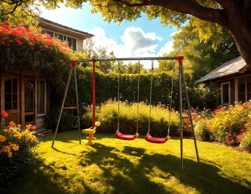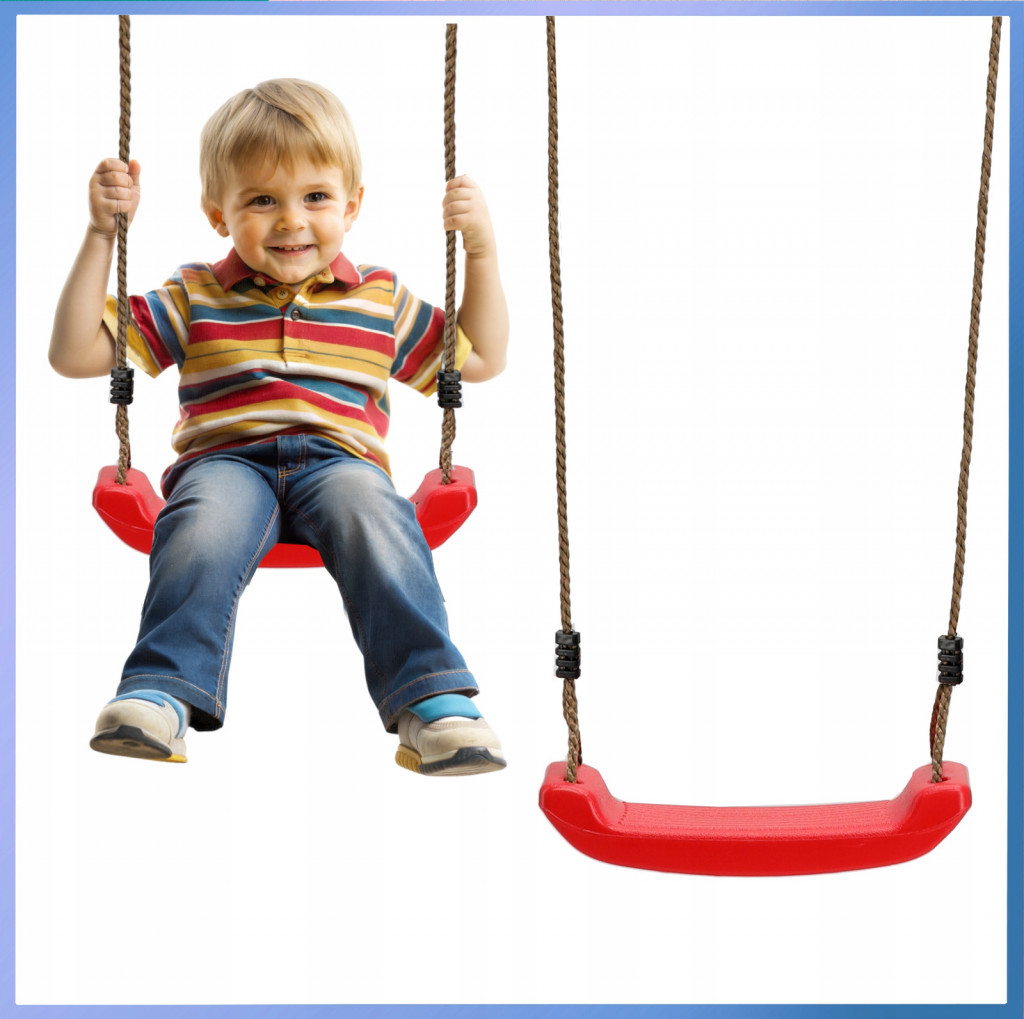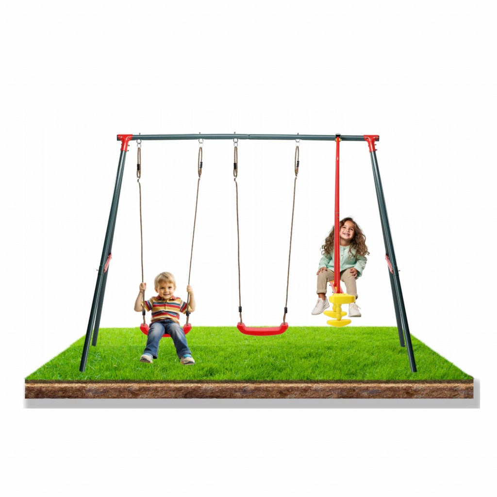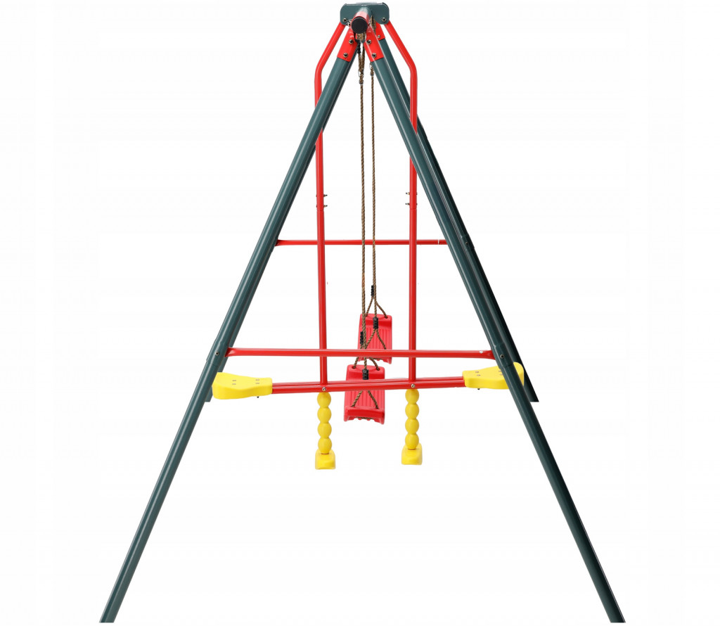 Vybavení: 2 červená sedadla na houpačku, 1 žluto-červená houpací lavice (seesaw)