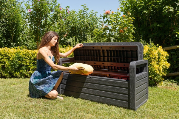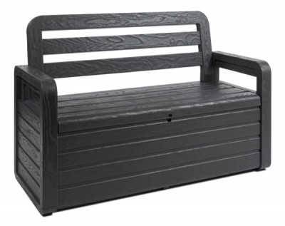 Zahradní plastová lavice s úložným prostorem vhodná pro venkovní použití. Lavice je vyrobena z plastu odolného UV záření s povrchem imitujícím povrch dřeva. Úložný prostor má objem 263 l se snadným otvíráním víka nad 90°, nosnost úložného prostoru je 35 kg. Robustní sedadlo zahradní lavice nabízí posezení pro 2 osoby, celková nosnost zahradní lavice s úložným prostorem je 320 kg. Úložný prostor zahradní lavice lze uzamknout visacím zámkem, který není součástí dodávky.