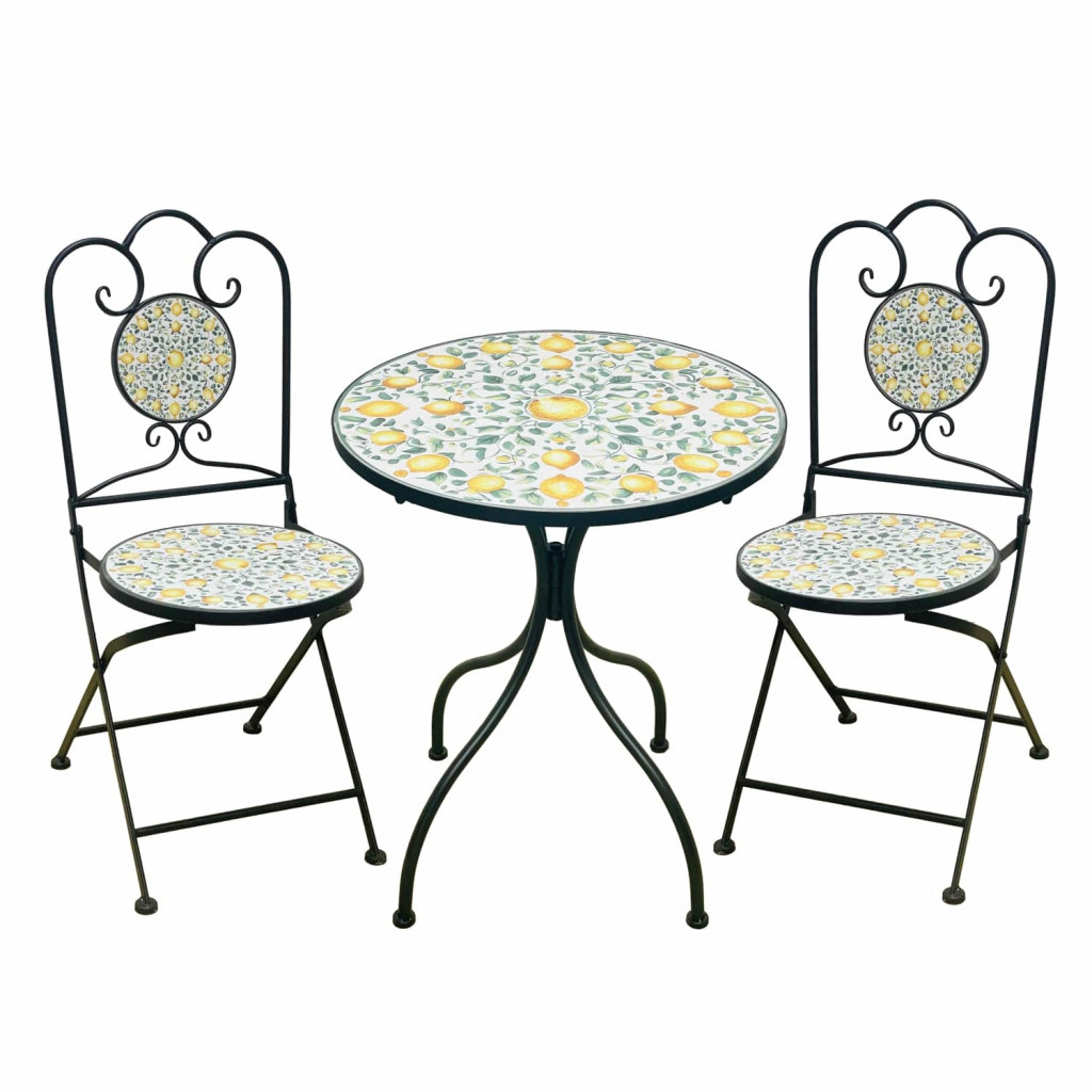 Sada kovového zahradního nábytku s mozaikou se vzorem citrónů. Sada obsahuje dvě židle a jeden stůl.