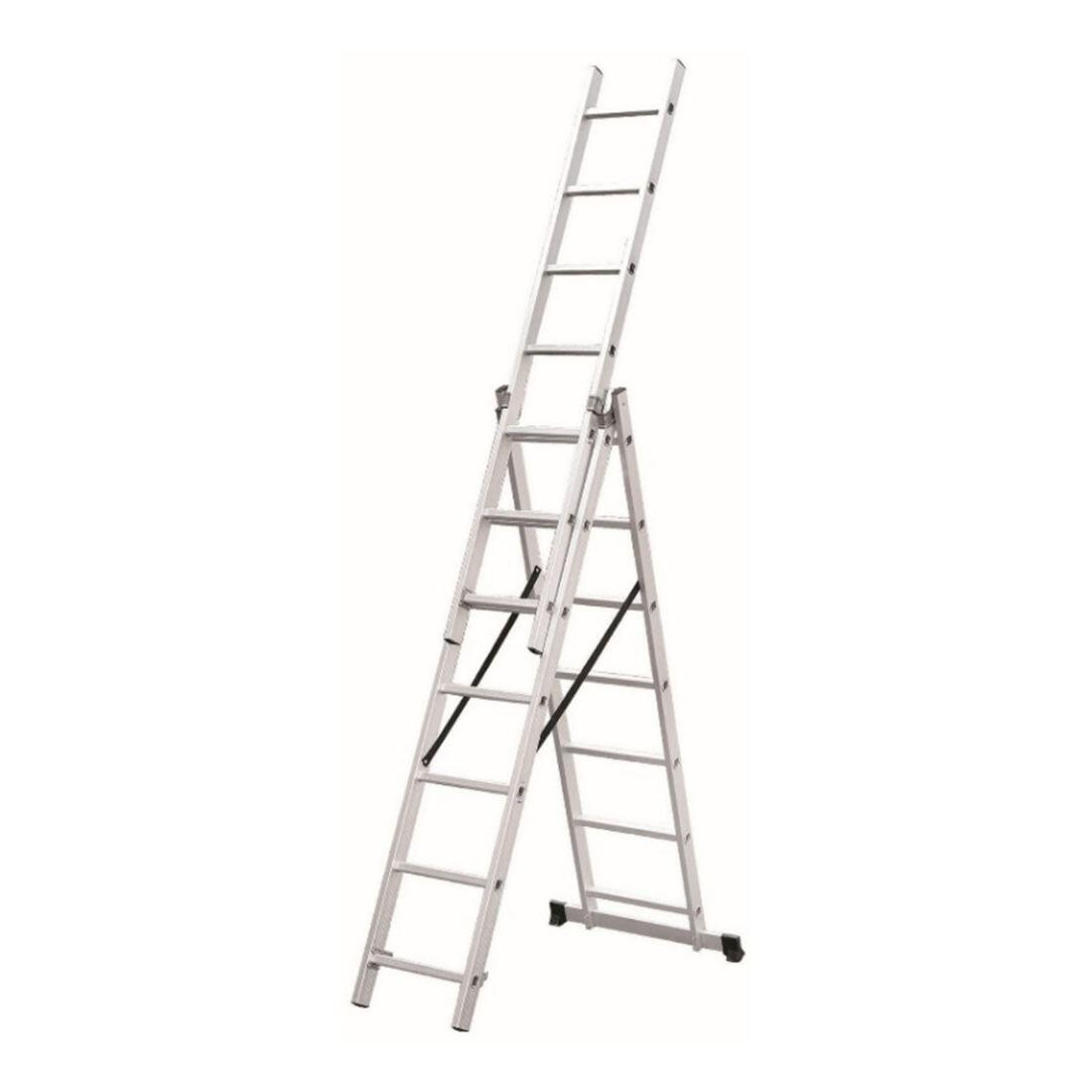 Žebřík univerzální Al, 3dílný, 9 příček, 5,93 m, nosnost 150 kg. - víceúčelový trojdílný žebřík po devíti příčkách - lze sestavit jako stojací štafle, výsuvný nebo opěrný žebřík - možnost nastavení výšky po jednotlivých příčkách - opatřen jisticími pásy - hliníkový žebřík dle normy EN 131 Kombinovatelný stojací a posuvný žebřík má různá použití. Lze jej použít jako stojací žebřík, stojací žebřík s nasazovacím dílem nebo 3dílný opěrný žebřík. materiál: hliník nosnost: 150 kg max. výsuvná délka: 5,93 m šířka: 470 mm nosnost: 150 kg počet příček: 3 x 9 Šířka přepravní: 47 cm Výška přepravní: 255 cm Hloubka přepravní: 16 cm Objem přepravní: 191,76 dm3 Hmotnost přepravní: 13,5 kg Materiál: hliník Provedení: trojdílný Maximální délka: 5,93 m Maximální zatížení: 150 kg Pozor křehké: