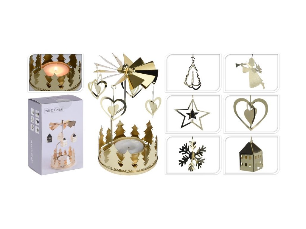 Zvonění andělské 13 x 8 cm ZLA 6 dekorů. rozměry: 13 x 8 cm barva: zlatá Vánoční kolotoč je příjemnou dekorací v období zimy. Vložte do něj zapálenou čajovou svíčku a ozdoby na kolotoči se roztočí.